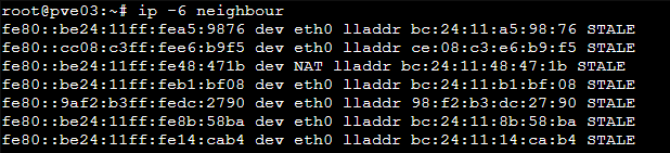 Da IPv4 und das neuere IPv6 Protokoll jeweils getrennt voneinander arbeiten, ist die Neighbour Tabelle für IPv6 unter Linux einsehbar mit folgendem Befehl:
